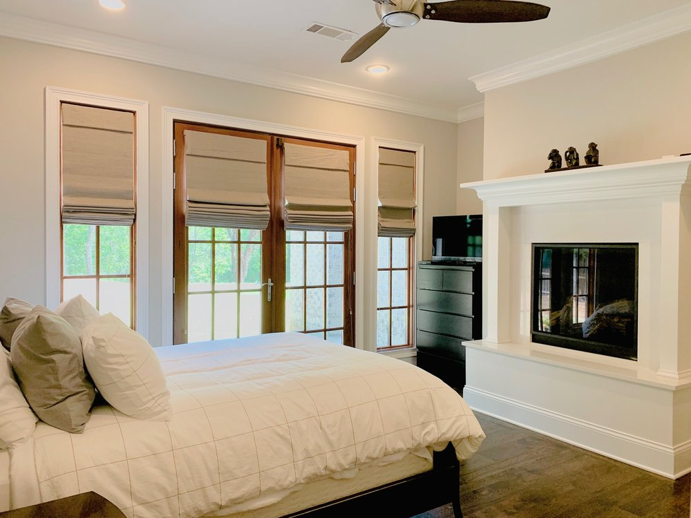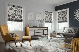 Roman shades are great for small windows and spaces as they take up very little space. Roman blinds have no stackback and require no room outside the window frame. We love our Roman blinds because they easily create both a welcoming look in living rooms and a clean, professional look in a home office. The only difference is the fabric and style you choose.